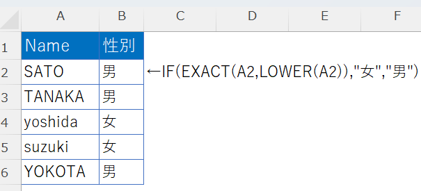EXACT(A,B)…AとBを比較して同じならTrue,異なるならFalseを返す。英字の場合は大文字と小文字を区別します。よって、AとBが同じなら○にするため、同じセルを比較し1つはLower関数で小文字にします。元々小文字なら同じと見なされるのでTrue、大文字なら異なるのでFalseが返ります(よって小文字ならTRUE)簡単なのでお試しください。